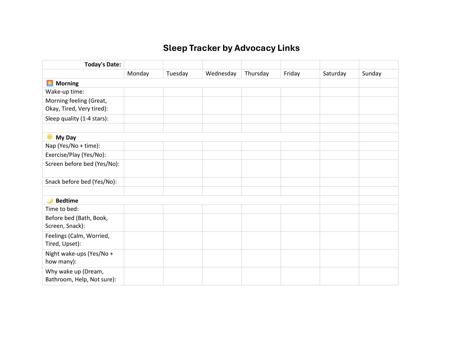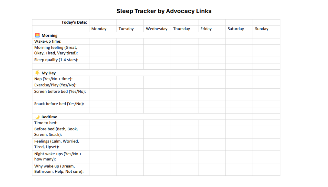 Download our easy-to-use Sleep Tracker as a Word document or printable PDF. Track your child’s sleep patterns, identify habits, and improve their rest. Feel free to download as often as you need!